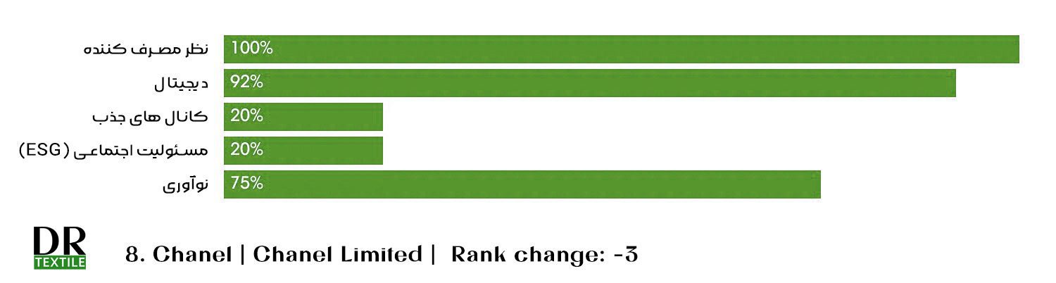 - منبع درآمد : این رتبهبندیها بر اساس ارزش بازار، درآمد سالانه و تأثیرگذاری فرهنگی برندها در سال ۲۰۲۴ تهیه شدهاند. در سال 2023، ارزش برند Chanel در سراسر جهان به 19.4 میلیارد دلار آمریکا رسید که نسبت به سال قبل افزایش یافته است. ارزش برند شانل در سراسر جهان در بازه زمانی 2017 تا 2023 روند مثبتی را تجربه کرد و در آخرین دوره گزارش شده 27 درصد رشد کرد.